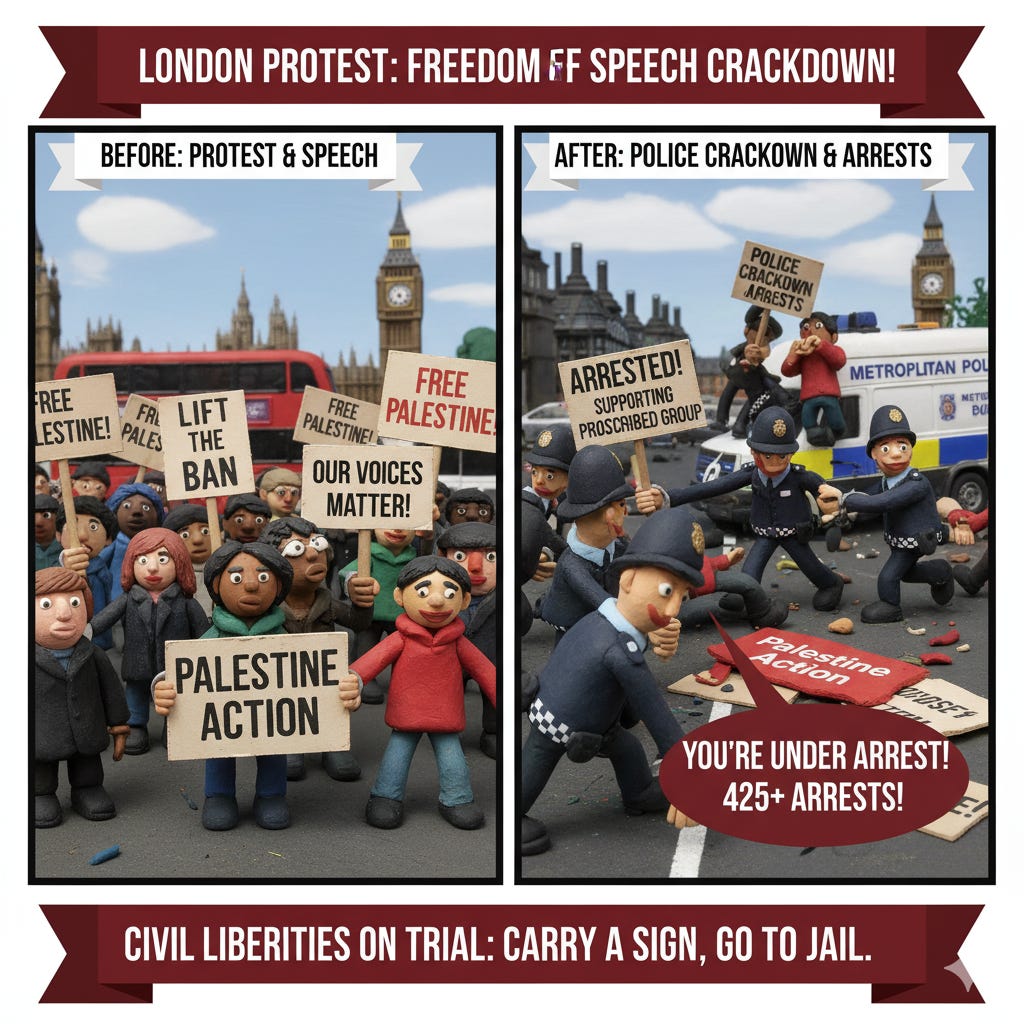 Why It Matters: This shows the sharp end of new anti-protest and anti-terrorism laws in the UK, where supporting a proscribed group, even with a sign, can lead to arrest, sparking a major civil liberties debate.
